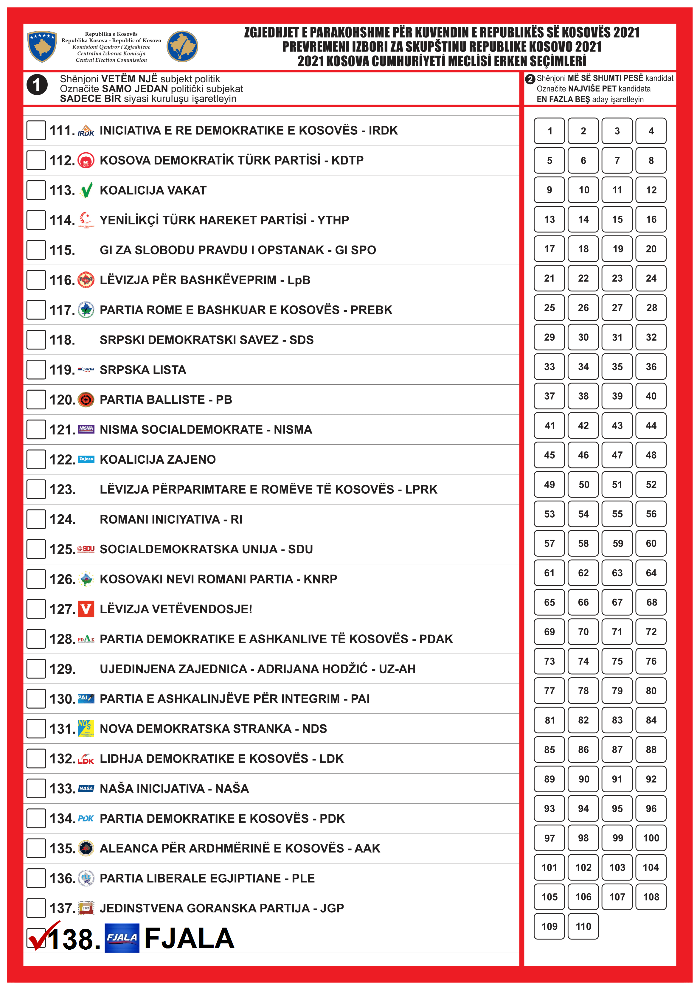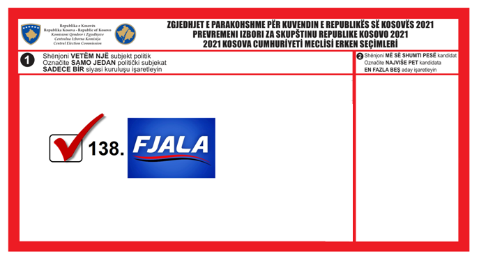 12 Shkurt, 2021 by Partia FJALA FLETËVOTIMI PËR ZGJEDHJET E 14 SHKURTIT Shëno vetëm një subjekt politik (jo më shumë se një) në anën e majt, duke votuar Partinë FJALA me nr.138 Shëno deri në pesë kandidatë (jo më shumë se pesë) në anën e djathtë.