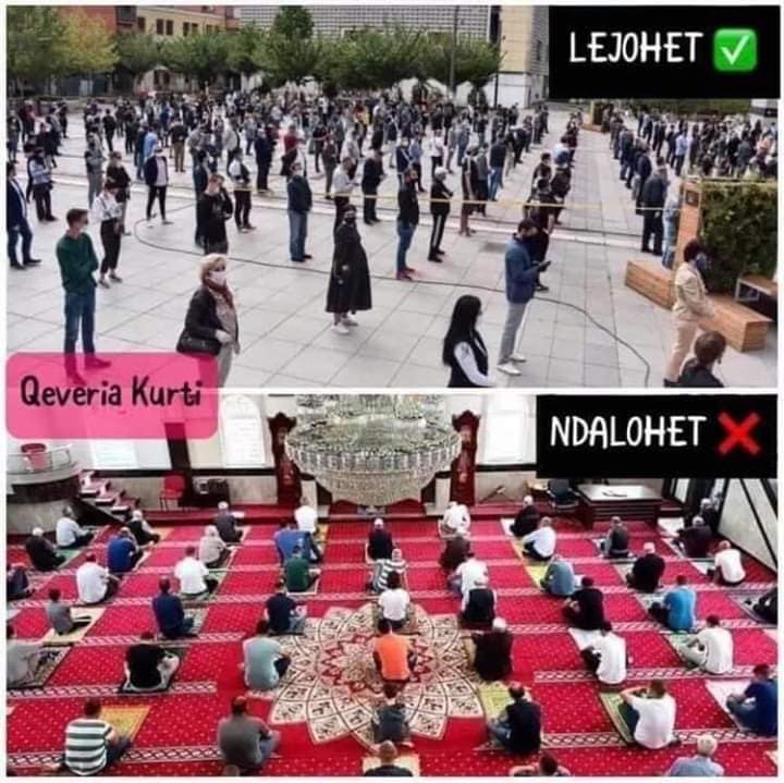 -Nuk lejon besimtarët të falin namazet në Xhamitë e Kosovës, ndërsa lejon pregaditjet për protestë në qendër të Prishtinës ( rreth 400 veta).