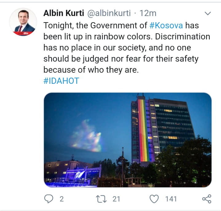 -Krenohet me ndriçimin e ndërtesës së qeverisë së Kosovës me ngjyrat e komunitetit LG…, ndërsa ma herët i kishte dëmtuar shumë ndertesa të Kosovës me molotov dhe mjete tjera.